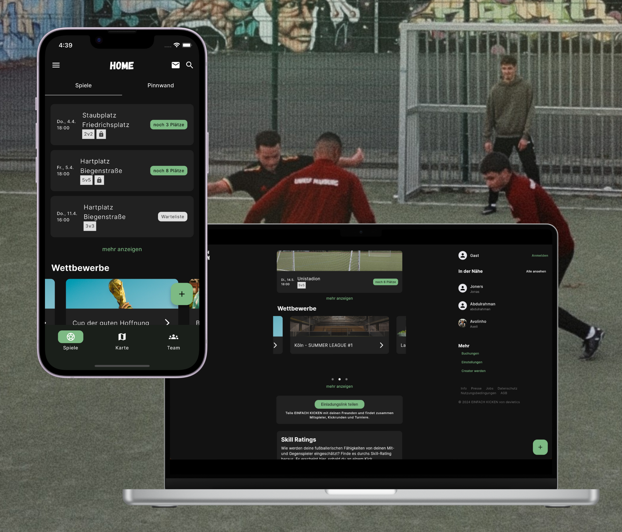 Mit EINFACH KICKEN begann die devletics-Reise, denn es war unser erstes Projekt, das wir von Anfang bis Ende entwickelt haben. Die App wurde von uns konzipiert, designt und entwickelt und ist seitdem ein fester Bestandteil unseres Portfolios. EINFACH KICKEN ist die ultimative App für Kleinfeld- und Straßenfußball! Finde Matches und Mitspieler in deiner Stadt, fülle Restplätze auf, organisiere deine eigenen Teams, fordere andere heraus und sammle Auszeichnungen nach jedem Spiel. Mit unserem einzigartigen Matchmaking und einem Leaderboard mit monatlichen Goodies bieten wir die perfekte Plattform, um sich mit der Fußball-Community zu vernetzen und auf den Bolzplätzen richtig durchzustarten!